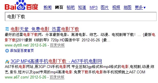 而我們搜索“電影下載”,百度就會將這些詞拆分為“電影”、“下載”和“電影下載”,如下圖: