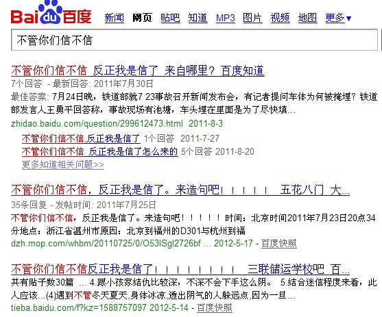 例如大家搜索“不管你們信不信”,一般來說這樣的句子肯定是要被分詞處理的,但是因為去年動車事件,這個句子已經(jīng)成為大家常用的詞語,百度也已經(jīng)對這個詞比較認可了,將他收入詞庫中,那么它就可以實現(xiàn)精準匹配。如下圖,網(wǎng)頁標題中都是精準匹配,未見分詞匹配: