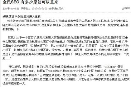 一位SEOER在帖子中不無(wú)憂慮地寫道:“.到處都是一樣的內(nèi)容,沒(méi)有創(chuàng)新,沒(méi)有新的東西進(jìn)來(lái),今天發(fā)個(gè)標(biāo)題:‘SEO的8個(gè)重要XXX’,明天……‘SEO的4個(gè)重要XXX’把8個(gè)捏成4個(gè)寫……但是你又不能不寫,我們還是得厚顏無(wú)恥的寫下去”。