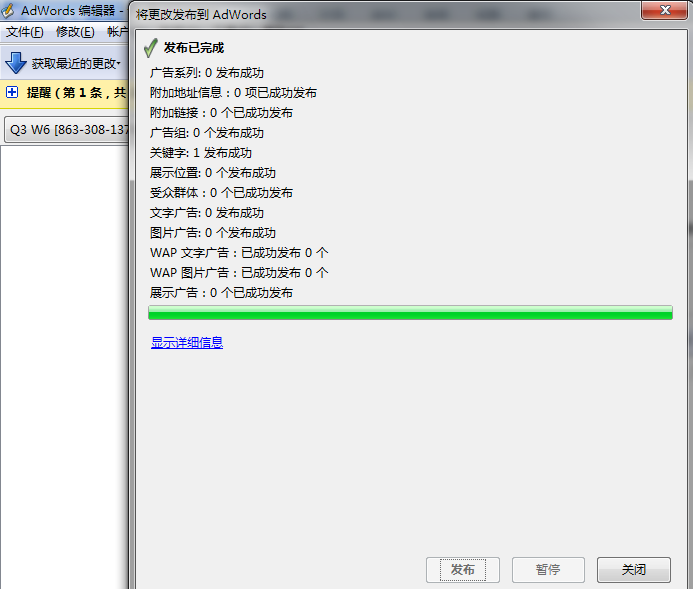 第四步:發(fā)布更新完成以后,關(guān)閉更新成功選項(xiàng)卡,便可進(jìn)入GOOGLE廣告頁,查看關(guān)鍵詞更新的內(nèi)容;