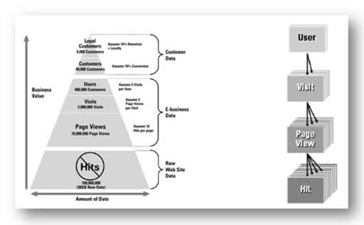 那么我們能從日志中得到哪些基礎(chǔ)數(shù)據(jù)呢?看看下面這個圖,縱向的把收集到的數(shù)據(jù)進行分析并劃分了幾個層次,這個圖也描述了一個目前很廣泛使用的基于日志的統(tǒng)計分析步驟:日志文件->PV->會話->使用者->客戶->忠實客戶,我們可以明顯地看出,金字塔越上層的數(shù)據(jù)就越具有商業(yè)價值。