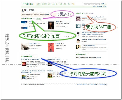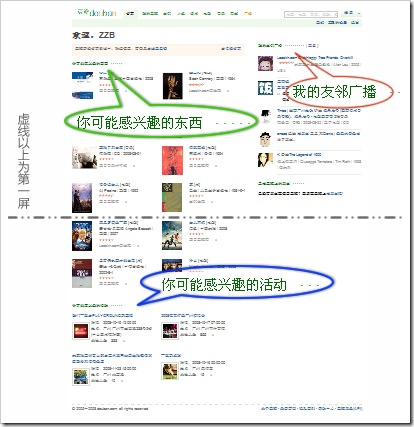 兩個(gè)“你可能感興趣”的部分都是屬于“滿(mǎn)足用戶(hù)自己都不知道的需求”,“你可能感興趣的東西”這部分為12(2×6)個(gè)關(guān)于影音書(shū)的推薦,“你可能感興趣的活動(dòng)”則是根據(jù)你的居住地與好友分布等來(lái)推薦一些活動(dòng),但這部分在頁(yè)面布局時(shí)卻被放在了第一屏(1024*768)以外,用戶(hù)會(huì)為了自己都不知道的需求經(jīng)常將滾動(dòng)條往下拉?