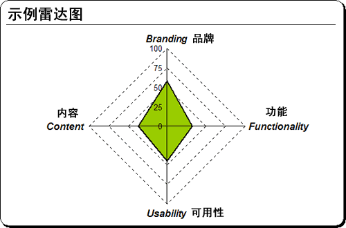 首先我們要做的是,把每個(gè)元素的所有的分值加總。因?yàn)槲覀円呀?jīng)設(shè)置了分值尺度,來(lái)為每個(gè)元素提供滿分為100的分?jǐn)?shù),我們真正得到的是一個(gè)百分比的分?jǐn)?shù)。一旦我們有了這些百分?jǐn)?shù),我發(fā)現(xiàn)最有效的是創(chuàng)建一個(gè)雷達(dá)圖來(lái)直觀地呈現(xiàn)。微軟的Excel或者Open Office Calc都很適合,盡管任何帶有圖表功能的數(shù)據(jù)表軟件都可以。