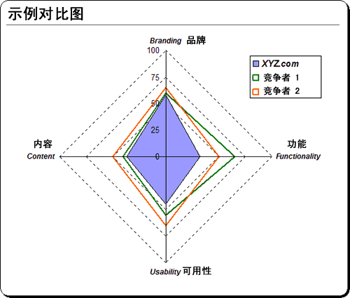 你當(dāng)然可以在分析中添加第五個(gè)類別來(lái)描述易用性(友好度)或者商業(yè)指標(biāo)。例如,你得到了一個(gè)政府客戶,需要嚴(yán)格遵循508規(guī)則(針對(duì)美國(guó))。你可以容易地創(chuàng)建一套描述或參數(shù)來(lái)專門(mén)處理易用性(友好度)元素,修改你的圖表來(lái)相應(yīng)展示。同樣,你也可以很容易地創(chuàng)建一個(gè)類別來(lái)專門(mén)處理你的客戶的重要商業(yè)指標(biāo),比如,ROI,點(diǎn)擊率,轉(zhuǎn)化量,或者重復(fù)顧客數(shù)。