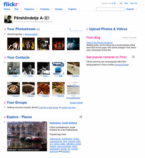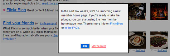 In the next few weeks, we’ll be launching a new member home page. If you’re ready to take the plunge, you can start using the new member home page now. There’s more info on FlickrBlog or in the FAQs.