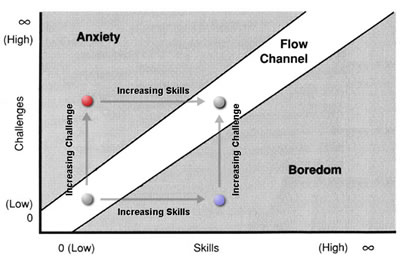 隨著面對的挑戰(zhàn)的增加,我們的焦慮逐漸增加并且偏離了流,重新回到流涉及到掌握更多的技巧以應(yīng)付那些挑戰(zhàn),減少我們的焦慮;當(dāng)我們的技巧增加我們會覺得無聊,會尋找更大的挑戰(zhàn)以匹配我們的能力技巧.
