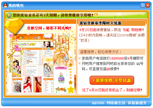 當(dāng)用戶的黃鉆貴族身份即將到期的時(shí)候,從QQ聊天主面板上的“我的錢(qián)包”提示:“錢(qián)包”閃動(dòng),點(diǎn)擊后用一個(gè)490*300px的小窗口告知用戶續(xù)費(fèi)的詳情。