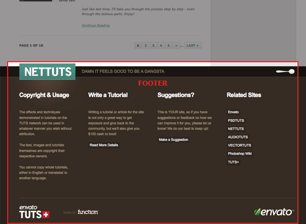 web頁(yè)面的尾部總會(huì)有一個(gè)頁(yè)腳,讓您的訪客知道他已經(jīng)到達(dá)了你web頁(yè)面的結(jié)束部分。和heaser一樣,footer也不是一個(gè)特殊的元素 。在你的頁(yè)腳里包含版權(quán),法律聲明以及主要的聯(lián)系方式。包含一些重要的鏈接是個(gè)好主意,比如home page, contact page, 等. 有些網(wǎng)站用這個(gè)區(qū)域提供一些相關(guān)材料或者其他重要信息。
