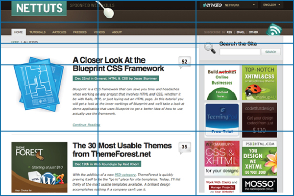 正如你看到的,NetTuts很好的遵循了黃金比率。頂端三分之一的網(wǎng)頁(yè)再次分成了三分,非常接近黃金比率。難怪NetTuts的設(shè)計(jì)是如此吸引人!