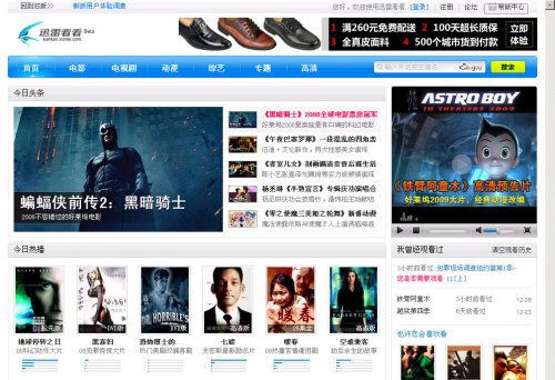 迅雷看看嚴格說不能算是獨立的視頻網(wǎng)站,但目前的人氣也是極速狂飆,依靠迅雷豐富的資源逐漸對其他視頻網(wǎng)站產(chǎn)生了很大壓力。最近迅雷看看剛剛改版,上圖是最新改版的頁面,由于迅雷看看定位非常清楚,放棄原創(chuàng)視頻和一些短片,專注于電視、電影、動漫、綜藝,頁面第1屏都是時下最流行的電影電視等,每個電影下面有用戶的推薦指數(shù),我個人覺得迅雷看看的首頁設(shè)計直接了當?shù)淖プ×擞脩粜枨;頁面右?cè)的觀看記錄是個非常貼心的設(shè)計,提醒用戶之前曾看過哪些電視電影,是否還要繼續(xù)看下集,我每次都會用這個功能。