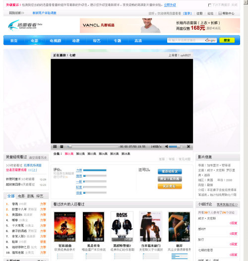 迅雷看看和土豆一樣也是采用居中播放,而且還變寬了,但2側(cè)目前還是空著的,不知道以后會不會放廣告。迅雷看看最大的特點是把電影自動裁剪能若干個小段落,這樣在緩存時速度更快,如果是連續(xù)劇的話會整理好每一集形成列表,用戶無需再重新搜索下一集,這是其他視頻網(wǎng)站無法做到的,有點B2C的感覺。迅雷看看在用戶體驗上還特別考慮到用戶之間的聯(lián)系,“看過該片的用戶還看過”這個功能非常人性化的,喜歡同一片的用戶他們的喜好可能是一樣的,這個功能被使用的也是很廣泛,當當網(wǎng)就有類似的功能。
