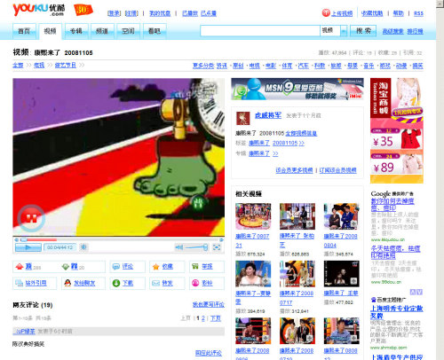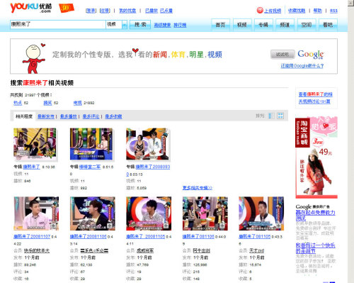 這頁搜索框又回到右側(cè)了,優(yōu)酷的播放區(qū)域是靠左側(cè),寬度大概占了半個屏幕,播放區(qū)域下側(cè)是一些常用的用戶行為按鈕,比如收藏、引用等;右側(cè)是視頻信息及相關(guān)視頻,整個第一屏涵蓋了主要的信息,用戶可以一目了然無需拖動滾動框。但整個頁面的廣告部分有點亂,雖然設(shè)計師把廣告放在右側(cè)盡量不影響用戶的瀏覽,但由于google AD這種是隨機產(chǎn)生內(nèi)容,有時會出現(xiàn)八桿子打不到一起的廣告內(nèi)容,因此頁面會顯得比較凌亂,我個人并不太贊成放google ad這樣的廣告,或者是一個頁面不要放太多不同類型的廣告。
