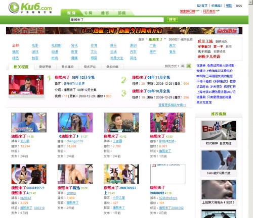 在搜索列表頁的頂部倒是大幅的簡化,就留了4個大類和一個搜索欄;酷6的搜索列表頁整體布局和優(yōu)酷差不多,有一點改進的是把專輯視頻和下面普通視頻中間加了一條分割線,這樣雖然沒有很明顯但也至少做了一個區(qū)隔;但這個頁面最大的問題是顏色非;靵y,光藍色就有4種,還同時充斥了灰色、黑色和橘色,這是很不應(yīng)該犯的錯誤。