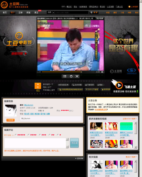 土豆播放頁的布局是比較大膽的,采用居中播放+大背景廣告的形式,而且整個頁面采用黑色背景;我想設(shè)計師是想給用戶一個在電影院看電影的感覺,我個人是滿喜歡這種設(shè)計的,雖然變成了黑色,但頂部導航欄布局沒有發(fā)生任何變化,對用戶的影響其實并不大。而且土豆近期在播放功能上下了功夫,除了像飛速土豆這樣的軟件外,在線還可以調(diào)視頻亮度,這是非常實用的功能。不過由于這種居中的設(shè)計,相關(guān)視頻和推薦視頻的區(qū)域就被迫放到第2屏,用戶瀏覽起來會造成不便,如果能把相關(guān)視頻放在視頻左側(cè)做成彈出式的設(shè)計也許會更好。