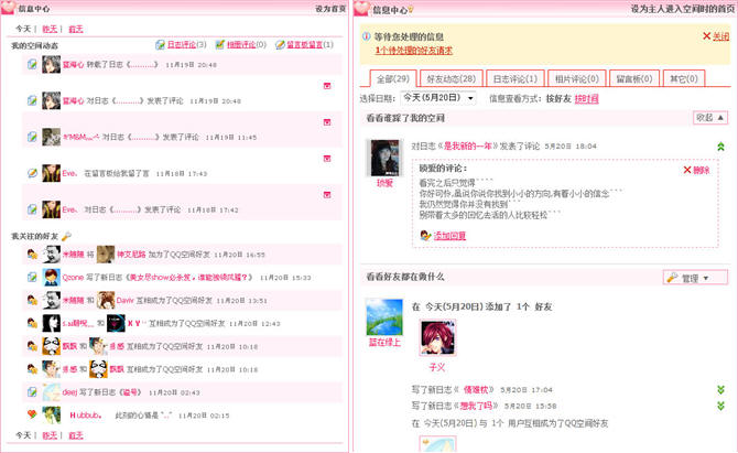 假設(shè)信息中心即是一個展示最近更新動態(tài)的地方,哪怕只是今天。更多的更新可以考慮有單獨(dú)的更新頁面。假如我有一段時間沒有來空間,今天看到有一則更新,更多更新我未查看的,會有一個跳轉(zhuǎn)到詳細(xì)的列表頁陳列出來。我的好友們今天沒有做什么變動,在好友圈里我可以看到他們最近一段時間的更新。就好像新小紙條的提醒,僅僅需要告訴我有多少條我未閱讀,而我需要去閱讀的時候,則進(jìn)入小紙條欄目閱讀,并可以做更多互動的操作。