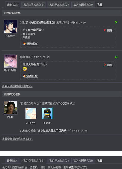 重新整理了導(dǎo)航,首頁列舉了前幾條新的動態(tài),全部的動態(tài)可以通過點(diǎn)擊更多或相關(guān)的導(dǎo)航標(biāo)簽進(jìn)入查看。我的空間動態(tài)、我的好友動態(tài)、以及后續(xù)的更多更新動態(tài)(校園)作為信息中心的導(dǎo)航。