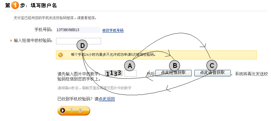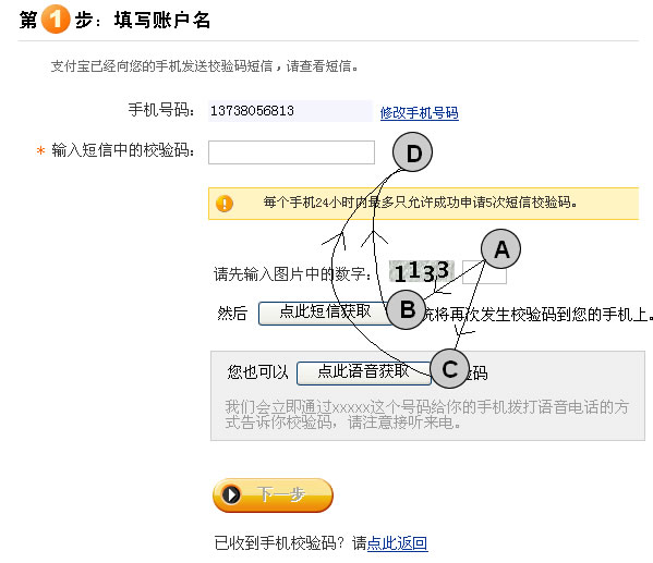支付寶的手機(jī)注冊(cè)(獲取第二次手機(jī)驗(yàn)證碼后的頁面)