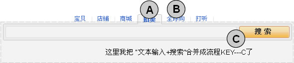 淘寶搜索框上面的 寶貝/店鋪/商場/拍賣/全球購/打聽 每一個卡片都是流程中的KEY,因為整個搜索區(qū)域就是一個流程域。