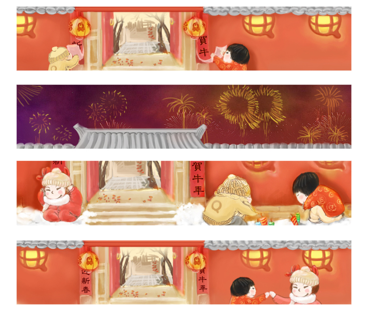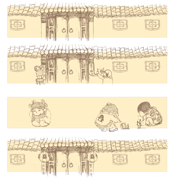 眾人腦爆得出三種改革方向:其一,保持原有單幀畫面形式,采取文字組合方式進行繪制,強調品質。其二,采用動態(tài)場景形式,以小范圍的動畫,如飄雪,星星閃爍等,增強Banner趣味性,豐富表現(xiàn)形式。其三,劇情或故事形式,突出情節(jié),分段展示,使用戶更好地融入節(jié)日氛圍。在會議之后的小范圍的討論中,眾人亦積極提供方案,托哥提出不能浮于表面,止于視覺表現(xiàn),從而導致表意直白而不含蓄,缺乏內涵的情況,亦給出領導之前提出從郵票上尋找靈感的建議。最后確定用劇情及故事形式作為新形式嘗試設計。確認這個方向之后,在符合整體思路情況下,以春節(jié)作為試點,進行了初稿設計,在尋找春節(jié)相關資料時發(fā)現(xiàn),傳統(tǒng)春節(jié)的習俗保留到現(xiàn)在的已不多,而且在不同地區(qū),方式也有所區(qū)別,不過貼春聯(lián),節(jié)前打掃衛(wèi)生,放鞭炮等習俗還是一直保留著,即使在最繁華的都市里也如此。于是在草稿設計階段,用春聯(lián),鞭炮,小孩新衣裳等傳統(tǒng)元素,突出春節(jié)氣氛,并結合節(jié)前節(jié)后相關習俗進行繪制: