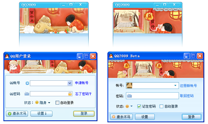 QQBanner自2006 年推出之后,豐富多彩的登錄畫面,給予用戶許多歡樂。之所以對QQ Banner作出改變,源由公司“防低齡化”的策略,加之QQ2009新的視覺風格,因此圍繞大氣、穩(wěn)重、含蓄、富有內涵、提升品質這幾點對09年的 Banner進行改變,重在增強Banner影響力,使之意義更重大,意味更深遠。