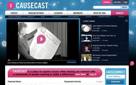 Causecast 使用顏色非常有效。4個粉紅色元素跳到你眼前:logo,反饋鏈接,捐贈鏈接和網(wǎng)站描述信息。