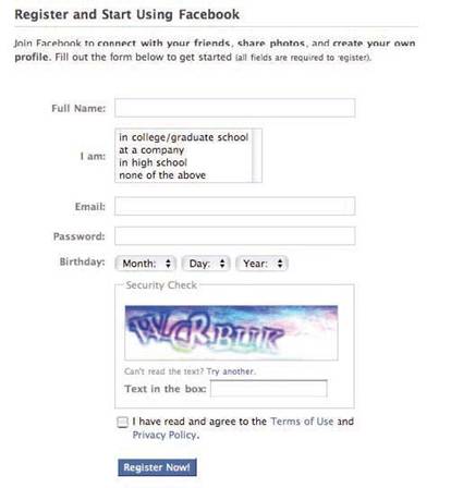 流行社交網(wǎng)站Facebook的注冊表單,這張表單幾乎一半都用于顯示安全檢查!
