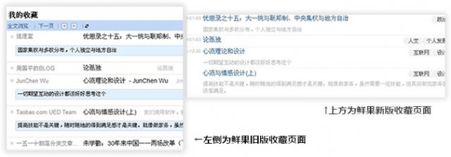 之前寫了《blogbus的后臺(tái)操作易用性》一文講述Blogbus后臺(tái)操作在易用性上不做刻意追求是可以理解并接受的,道理其實(shí)就是今天這篇文章的主旨。基本上一個(gè)人能夠成為產(chǎn)品設(shè)計(jì)師或者產(chǎn)品經(jīng)理,都是具備一定的實(shí)力功底,尤其是有一定流行度的產(chǎn)品擔(dān)綱者。嘗試?yán)斫猱a(chǎn)品(原)設(shè)計(jì)者的設(shè)計(jì)意圖,將幫助我們更好的進(jìn)行產(chǎn)品改進(jìn)以及新產(chǎn)品的設(shè)計(jì)。就說(shuō)最近的鮮果改版,新的產(chǎn)品設(shè)計(jì)師顯然沒(méi)有對(duì)原設(shè)計(jì)師的設(shè)計(jì)意圖有充分的理解,請(qǐng)看下面這張對(duì)比圖