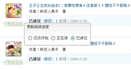 “我的書架”中的“閱讀進(jìn)度-修改”當(dāng)當(dāng)是用MouseOver展開的菜單。