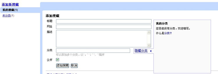 2、點(diǎn)擊“添加新搜藏”鏈接,在“添加搜藏”欄中填寫標(biāo)題、網(wǎng)址、描述、分類信息。在這里我們填寫自己網(wǎng)站的對應(yīng)信息。確!肮_”選項(xiàng)處于選中狀態(tài),這樣在非登陸狀態(tài)下別人也能夠看到我們的收藏信息。