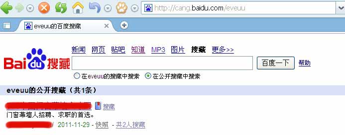 這樣,我們的收藏就添加完成了,我們可以點(diǎn)擊“我的搜藏”鏈接查看已添加的收藏。也可以直接通過訪問網(wǎng)址http://cang.baidu.com/百度用戶名,來查看你的收藏信息。