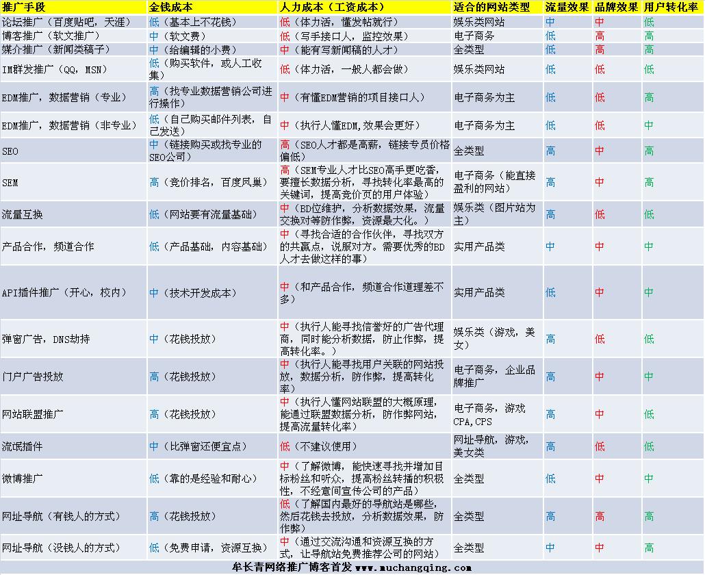 其實(shí)還有個(gè)非常重要的指標(biāo)沒寫出來,就是各個(gè)推廣渠道的性價(jià)比。比如彈窗推廣,雖然用戶轉(zhuǎn)化率低,但是金錢成本也不高,操作得好,性價(jià)比就會非常高。“性價(jià)比”這個(gè)標(biāo)準(zhǔn)比較模糊,如果能把每一樣推廣手段做到極致,都能把“性價(jià)比”做得很高,關(guān)鍵是看誰去執(zhí)行和操作了。希望這個(gè)圖能給一些才開始做網(wǎng)絡(luò)推廣的公司,有一定的參考。因?yàn)樽约旱慕?jīng)驗(yàn)有限,實(shí)踐過的推廣手段也有限,所以也不保證圖中的高中低指標(biāo),分析都正確,歡迎有把上面部分推廣手段做到極致的朋友,一起來交流指正。