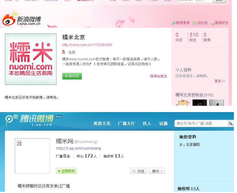 如圖:糯米網(wǎng)在新浪微博和騰訊微博的人氣現(xiàn)狀(數(shù)據(jù)截止晚上8點20分)