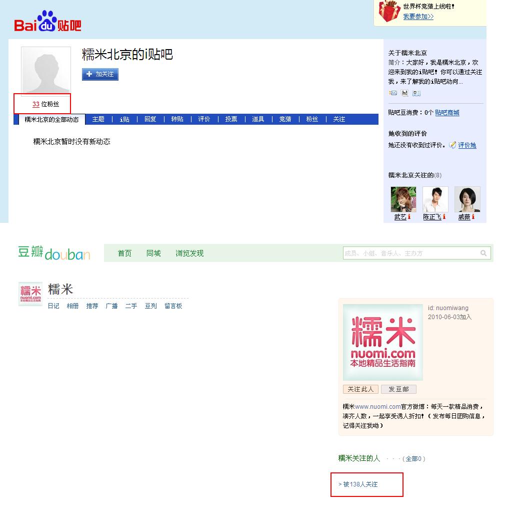 如圖:糯米網(wǎng)在百度I貼吧和豆瓣的粉絲數(shù)和被關(guān)注的情況。(數(shù)據(jù)截止晚上8點20分)