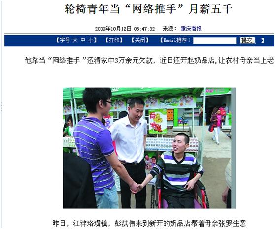 我的重慶老鄉(xiāng)“彭洪偉”,經(jīng)?次也┛偷呐笥褢摱贾溃且粋雙腿失去知覺的殘疾人。他就是08年初才開始學習網(wǎng)絡推廣,才開始的時候我有教他一些簡單的學習思路,后面主要還是靠他自己的勤奮努力。在學習網(wǎng)絡推廣不到2個月的時候,就開始嘗試做網(wǎng)絡水軍這樣簡單的推廣兼職工作,慢慢自己寫個人博客,做個人網(wǎng)站積累了更多的推廣經(jīng)驗。在09年的時候,彭洪偉就在網(wǎng)上找了一份月薪5000元的兼職工作,當時有多個媒體還對其進行了報道。