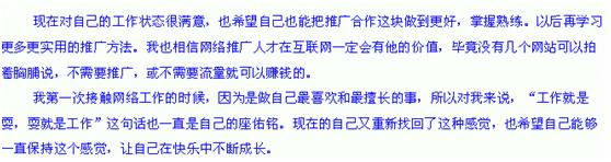 當時我做互聯(lián)網(wǎng)工作也就1年多,會的網(wǎng)絡推廣手段也很少,論推廣經(jīng)驗,可能比現(xiàn)在很多朋友都要差。但因為通過博客展示了自己,所以找工作就變得很容易。所以在這里建議所有做網(wǎng)絡推廣的朋友,有時間都可以弄個自己的博客,不管是獨立博客,還是第3方的。至少有個展示你思想的地方,從而讓更多人可以更加的了解你,從而也增加了你的就業(yè)機會。有些朋友找工作困難,主要就是不善于把自己的擅長的方面表現(xiàn)出來,從而錯過了一些機會,也讓一些企業(yè)錯失了人才。