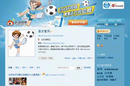 活力寶貝微博之所以如此備受粉絲關(guān)注,并非只是因?yàn)樗投Y活動(dòng),更是因?yàn)檫@一虛擬人物的足球?qū)氊愋蜗笈c世界杯主題完美融合。同時(shí),活力寶貝微博利用開(kāi)心賬號(hào)和微博的互通,在開(kāi)心網(wǎng)上建立聯(lián)合賬號(hào),跨網(wǎng)絡(luò)的宣傳,擴(kuò)大了活動(dòng)的影響力,也大大增加了活力寶貝微博粉絲數(shù)量。