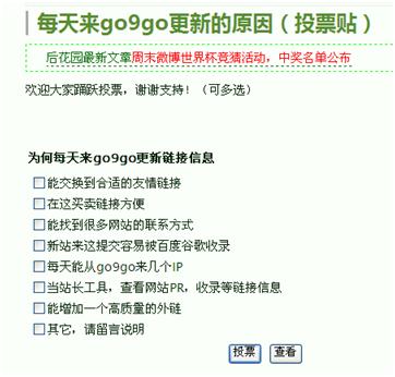另外我還在自己博客發(fā)起過一個“每天來go9go更新的原因”的投票貼,其實(shí)醉翁之意不在投票,而是通過投票讓用戶了解go9go的一些功能特點(diǎn)。從而更加的愿意經(jīng)常訪問使用go9go鏈接平臺。最終這個帖子有600多人進(jìn)行了投票,3000多人瀏覽,169個人進(jìn)行了評論,取得不了錯的反響。