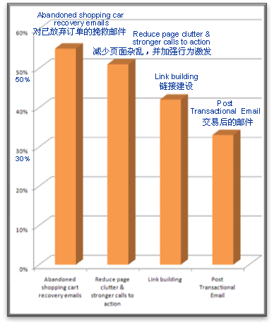 這次調查按轉化的四個關鍵領域,對他們的優(yōu)先考慮進行了深入研究?疾斓乃膫領域如下:搜索引擎優(yōu)化(SEO),著陸頁的優(yōu)化,郵件營銷,網站轉化/購物車挽救技術。