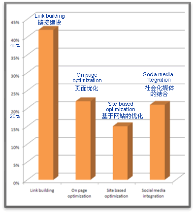 營銷人員計劃集中于鏈接建設,這是未來12個月他們最優(yōu)先的考慮,42%表明這是SEO最集中的焦點。對網站頁面進行改造,以確保更高的搜索引擎友好,以22%位列其次,還有21%打算關注社會化媒體的結合;诰W站的優(yōu)化(site-based optimization,比如網站地圖和導航),在主要關注里僅占15%。從這些發(fā)現(xiàn)里可引出兩個值得注意的結論: