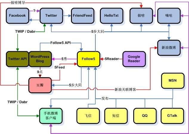 有點(diǎn)眼暈嗎?我第一次看見這張圖的時(shí)候也是相當(dāng)暈。Follow5.com恐怕是目前國(guó)內(nèi)市場(chǎng)上支持同步功能最全面的微博了,也是“同步控”們的最愛。本文就以Follow5微博作為本文使用的網(wǎng)站。