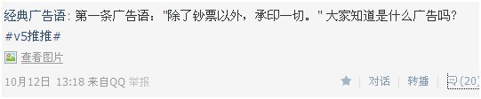 首先要有一定數(shù)量的聽(tīng)眾后才能采取次方案,前期可以先挑一下精彩的資料和大家分享下,這樣可以增加一下曝光度和知名度便于互動(dòng),比如我分享了一個(gè)經(jīng)典廣告語(yǔ)然后讓大家猜猜是什么廣告,調(diào)動(dòng)了大家的興趣和積極性有許多認(rèn)證的都轉(zhuǎn)載了如圖: