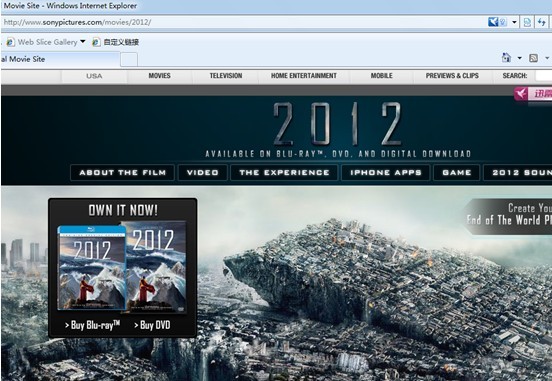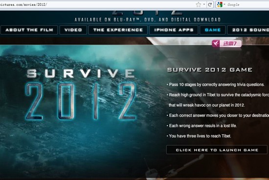 在電影<2012>的官方網(wǎng)站中有一個(gè)與電影相關(guān)的在線游戲,通過(guò)在線游戲讓網(wǎng)名在娛樂(lè)中感受電影。