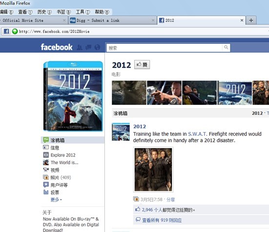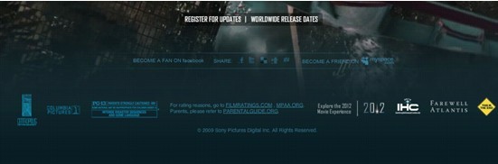 電影<2012>曾分別在facebook和myspace上建立過(guò)自己的專題頁(yè)面,有不少粉絲都紛紛加入,而<2012>在這些社交平臺(tái)里的更新,所有粉絲都會(huì)看到,并進(jìn)行評(píng)論,眾所周知,現(xiàn)在社交化平臺(tái)的推廣已經(jīng)非;馃,社交化平臺(tái)的推廣已然成為趨勢(shì)。