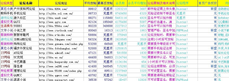 在找到一定數(shù)量的符合條件的論壇地址以后,我們要做一個(gè)非常詳細(xì)的表格用來(lái)統(tǒng)計(jì)分析采集來(lái)的數(shù)據(jù),用什么樣的工具制作表格都沒(méi)有限制,但是為了數(shù)據(jù)看起來(lái)更直觀清晰,通常都是用excel表格來(lái)制作的。下面要說(shuō)的是最重要的內(nèi)容,我們要分析一個(gè)論壇或網(wǎng)站的哪些數(shù)據(jù)才能判斷出網(wǎng)站論壇的綜合成績(jī)。判斷一個(gè)網(wǎng)站論壇有很多方面的數(shù)據(jù),拿這次收集發(fā)貼量在3000以上的行業(yè)論壇為例,下邊一些項(xiàng)目是不可缺少的如,論壇平均發(fā)帖量、論壇會(huì)員數(shù)量、aleax排名、百度搜錄數(shù)量、谷歌搜錄數(shù)量等數(shù)據(jù),如果想更全面的話,還可以加入雅虎反項(xiàng)鏈接數(shù)量、論壇是否可投放廣告、論壇網(wǎng)站使用程序等項(xiàng)目,可根據(jù)自己要的數(shù)據(jù)內(nèi)容進(jìn)入增減。