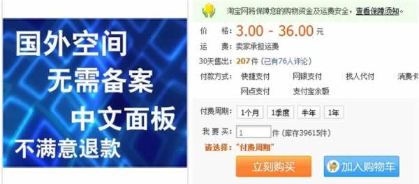 淘 寶上有一些廣告,如“國外空間、無需備案、中文面板、不滿意退款,銷售價格是3元/月”。盧松松看到類似廣告時,一直懷疑它的真實(shí)性,但發(fā)現(xiàn)賣出了200 多件,并且反映效果不錯,這才發(fā)現(xiàn)原來是真事。不過這種空間要求嚴(yán)格,訪問速度讓人郁悶,還經(jīng)常掛掉,空間維護(hù)也不及時。