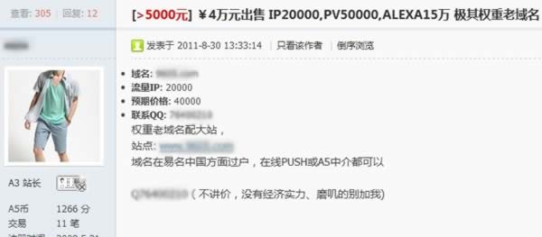 A5 網(wǎng)站交易板塊中,就有寫著“¥4萬元出售 IP20000,PV50000,ALEXA15萬 極其權(quán)重老域名”帖子。如圖所示:大家好奇的點(diǎn)開此網(wǎng)站后發(fā)現(xiàn)是個導(dǎo)航站,發(fā)現(xiàn)該站SEO的各項(xiàng)數(shù)據(jù)很不給力,2WIP如果是真的,多半是不正規(guī)的推廣方 式,最重要的是這條帖子老發(fā),我搜下了,竟然出現(xiàn)相同帖子近10條。所以我們能得出結(jié)論,他是以出售網(wǎng)站之名,行推廣之事。