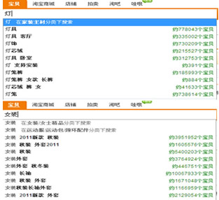 講淘寶銷(xiāo)售情況時(shí),我要特別插播一段,就是我個(gè)人的裝修經(jīng)歷,在09年辭職出來(lái)創(chuàng)業(yè),在杭州買(mǎi)了房子結(jié)了婚,我的房子裝修的產(chǎn)品幾乎全部來(lái)自淘寶,包括廁所的大件的馬桶,當(dāng)然,少不了燈了,我發(fā)現(xiàn)燈這東西單件價(jià)格不算特別貴,但是一間房子需要很多,所以一次下單都要買(mǎi)很多燈,三個(gè)房間都要一個(gè)大的吊燈,客廳要一個(gè)豪華的燈,廁所和廚房也要燈(這里的燈是另外一個(gè)集成吊頂那里購(gòu)買(mǎi)),以及家門(mén)口處,房間門(mén)口,地臺(tái)客廳里裝飾的一些小燈。這里就是非常大量的,也就是說(shuō),一個(gè)目標(biāo)IP可能會(huì)一次下單就購(gòu)買(mǎi)幾千元的東西。下面看一個(gè)搜索對(duì)比圖,看看燈具這個(gè)家裝行業(yè)的細(xì)分領(lǐng)域和大行業(yè)女裝行業(yè)的搜索結(jié)果進(jìn)行對(duì)比。