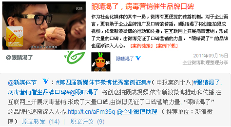 眼睛渴了整個運營案例單拆出微博營銷之道,在新浪微博相關企業(yè)活動中被@企業(yè)微博助理 制作成營銷案例分享,讓眼睛渴了再次影響了部分營銷人群受眾,同時新浪微博的推薦,眼睛渴了營銷案例被推薦到2011年的@新媒體節(jié) ,新媒體的推薦使得眼睛渴了無糖貝它糖的網(wǎng)絡熱度在10月中下旬再次回升。