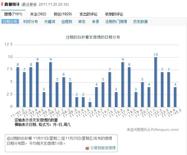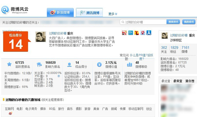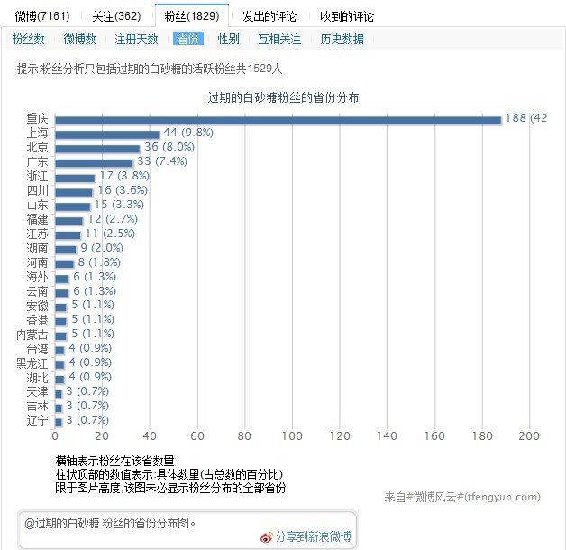 這里的統(tǒng)計包含了微博(即微博內(nèi)容)、關(guān)注、粉絲三大塊,微博內(nèi)容分析從日期分布、時段分布、關(guān)鍵詞、@提到、轉(zhuǎn)發(fā)、來源、近期熱門微博等數(shù)據(jù)有詳實的記錄。而關(guān)注和粉絲都從粉絲數(shù)、微博數(shù)、注冊天數(shù)、省份、性別等方面來統(tǒng)計,其中粉絲分析只包括該微博的活躍粉絲率。面對一個微博的眾多數(shù)據(jù),如何應(yīng)用就看微博運維人員的水平了,比如某Y省客戶要做該省的精準(zhǔn)營銷,那么在選取微博資源進行推廣時,需要考慮到的一個因素就是某微博紅人具有Y省活躍粉絲數(shù)量。
