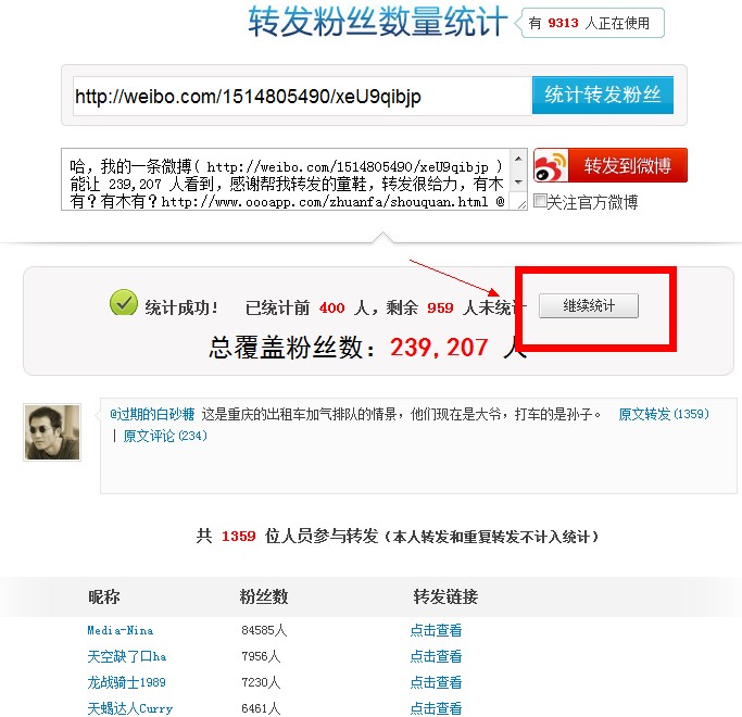 如果想要分析單條微博的傳播,那么“微博引爆點”和“轉(zhuǎn)發(fā)粉絲數(shù)量統(tǒng)計”就是一個絕佳的選擇。這兩款應(yīng)用的使用方法都類似,輸入某條微博地址,分析得出該條微博輻射范圍和覆蓋人數(shù)。